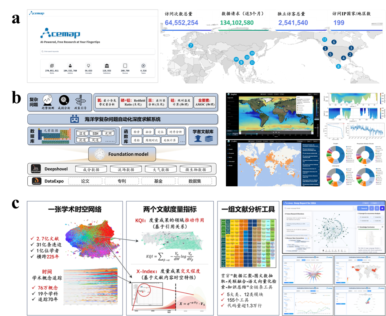 该平台以团队自主建设的亿级规模学术网络知识图系统Acemap(https://www.acemap.info)为数据底座,通过对海量学术数据的深度挖掘与语义理解,构建了“多圈层开放科学平台”和“学术概念演化时空图系统”,为科技管理与科学决策提供了数据支撑与系统分析能力。目前,Acemap已汇聚全球范围内的海量学术数据,吸引来自199个国家和地区的218万独立IP,累计访问量超6400万次,近三个月数据服务请求量超过1.35亿次,形成了覆盖广泛的学术资源网络。系统运行十年来累计形成193万行源代码,构建了迄今全球最大的多模态地学知识图谱,为平台运行与迭代提供了坚实的数据基础。