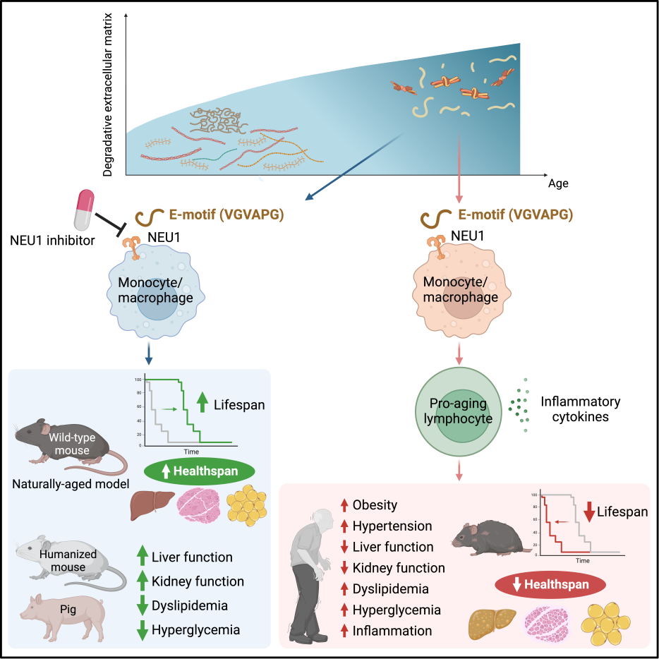 以往对个体衰老的研究主要聚焦于细胞衰老及其带来的效应。细胞外基质(Extracellular Matrix,ECM)主要包含弹性蛋白、胶原和透明质酸等核心成分,其重塑与降解会释放游离片段进入血液循环。研究团队在人类队列中发现,血清弹性蛋白含量与年龄、与衰老相关体检指标呈正相关,直接将弹性蛋白片段注射进小鼠体内会加速小鼠系统性衰老并导致其寿命下降。机制上,研究团队发现弹性蛋白片段通过其受体激活固有免疫细胞,导致慢性炎症;使用弹性蛋白受体抑制剂,可延长自然衰老小鼠寿命达17%,延缓小鼠和约克夏猪的衰老相关表型;细胞实验证实弹性蛋白受体抑制剂也可降低人类细胞炎症。