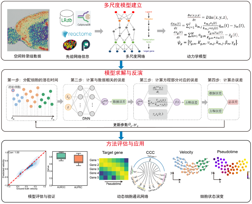 在国家自然科学基金项目(批准号:92570102)等资助下,中山大学数学学院孙小强教授课题组围绕“动态细胞间通讯驱动细胞状态演变”的关键科学问题,提出了“细胞通讯速度模型”——一种用于从静态的空间单细胞数据中推断动态细胞通讯网络与细胞状态演变的多尺度非线性动力学计算模型。该方法系统整合了细胞间相互作用与细胞内基因调控网络,为揭示细胞通讯在细胞状态转变过程中的动态调控机制提供了新的理论与计算框架。研究成果以“Decoding dynamic cell-cell communication-driven cell state transitions in spatial transcriptomics”为题,于2026年1月5日在线发表在国际学术期刊《自然・计算科学》(Nature Computational Science)杂志上,论文链接:https://www.nature.com/articles/s43588-025-00934-2。