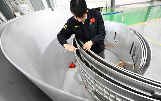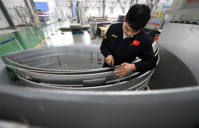 将手掌轻放在运载火箭贮箱壁板上,触之是合金的冰冷,感之实为中国航天的炽烈宏愿——想到它会直上九霄至浩瀚太空,记者不由得失了神。